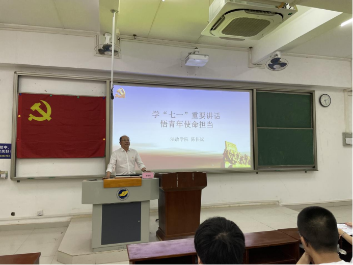 陈伟斌以“学‘七一’重要讲话,悟青年使命担当”为主题,带领同学们深入全面学习习近平总书记“七一”重要讲话,深刻领悟习近平总书记“七一”重要讲话的重大意义,并勉励同学们要有心存忧患的家国情怀、强国有我的社会责任感、敢为人先的创新意识、知行合一的实干才能,为实现中华民族伟大复兴而持续奋斗。