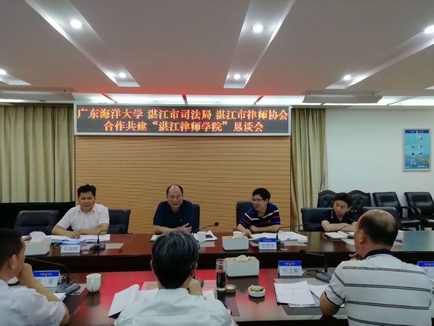 陈伟斌书记、张显伟院长、许国炯副书记、曹望华副院长等一行前往湛江司法局,与湛江市司法局、湛江市律师协会商谈合作共建“湛江律师六合直播