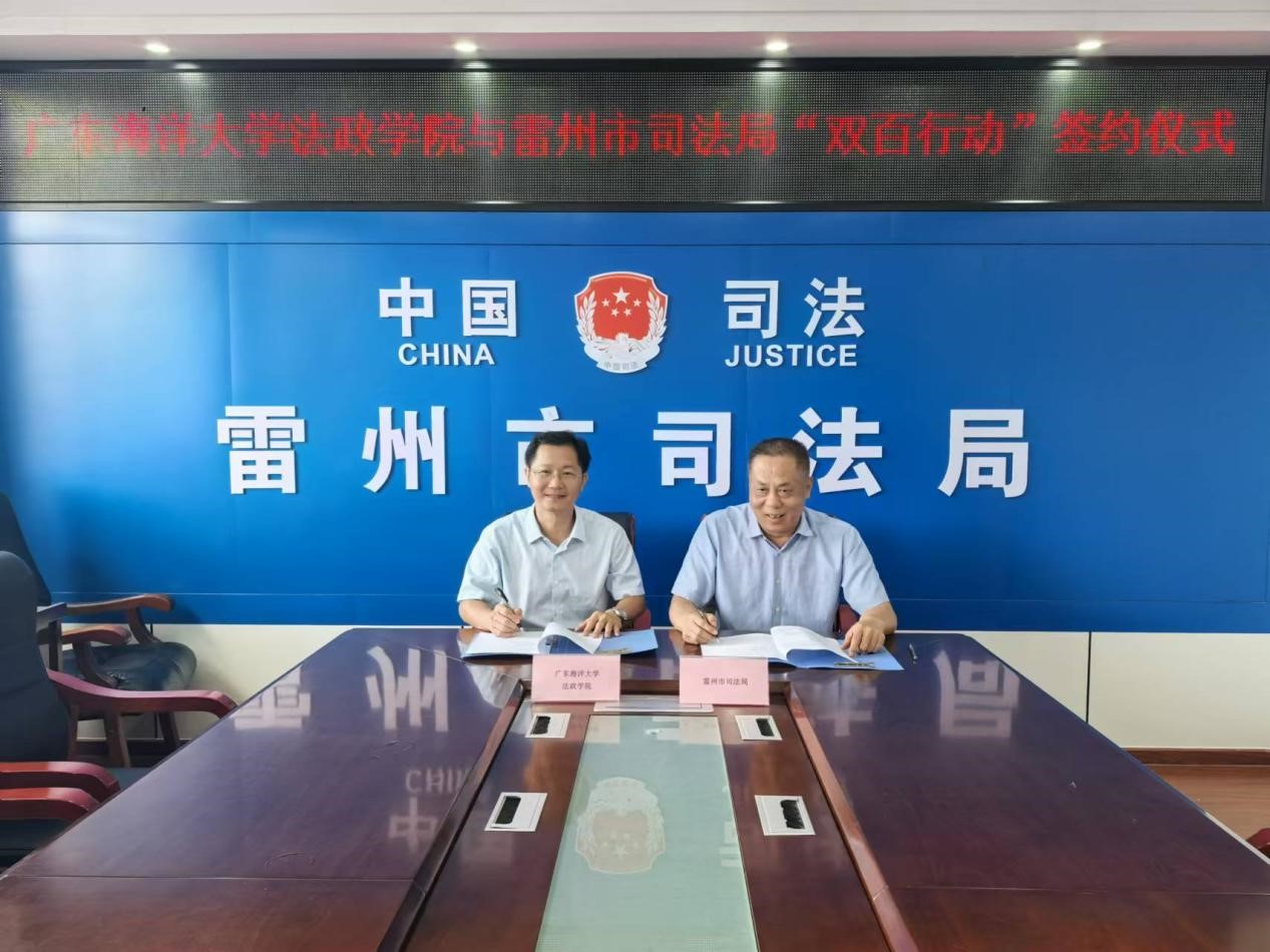 林忠新书记和雷州市司法局局长郑钧升代表双方正式签署了《关于落实“双百行动”方案的合作协议》。