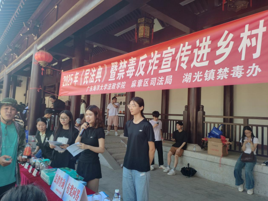 在旧县村文化楼,吴运时老师、支锦英股长带队,与李谦讲师,司法局肖宜媚、黄扬同志,以及法学1228全体同学,协同湖光镇禁毒办邱河安同志、驻村法律顾问戴雯雯同志,以演讲、问答等形式,向群众普及民法典、禁毒及防诈骗知识,有效提升群众的法律防范意识与自我保护能力。