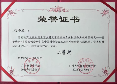 在第八届“风险、灾害与社会治理”分论坛上,社会学专业杨添发同学在刘勤老师指导下撰写的论文《嵌入视角下乡村灾害治理的内在机理和实现路径研究——基于梅州F县的案例分析》获邀参会。发言环节,他系统阐释了乡村自然灾害社会脆弱性评价体系与评估方法,运用基于嵌入视角的“过程-事件”分析框架及扎根理论编码技术,深入剖析乡村灾害治理的内在机理,并建议构建涵盖灾前预防、灾时应急、灾后恢复的优化路径,以降低灾害社会脆弱性,促进乡村灾害治理体系良性运转。该论文经分论坛主办方严格评审,荣获优秀论文二等奖。