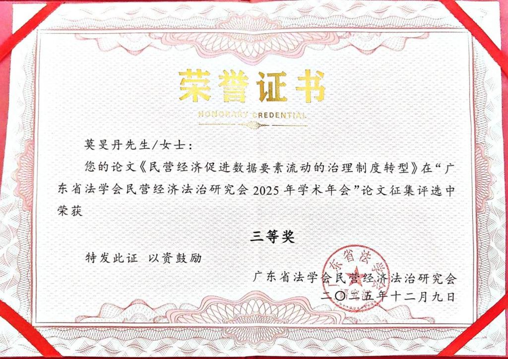 教师刘升副教授与莫旻丹博士作为广东省法学会民营经济法治研究会理事,应邀出席本次盛会。其中,莫旻丹博士在分论坛“民营经济发展的法治体系构建与制度创新”中作题为《民营经济促进数据要素流动的治理制度转型》的主题发言,莫旻丹博士立足于当前数字经济快速发展的时代背景,深入剖析了民营经济在数据要素在流动中的促进作用,系统阐释了现行治理在促进数据要素流动方面面临的实践困境,并提出了具有前瞻性和可操作性的制度转型建议。其发言逻辑严谨、观点鲜明,提交的同名论文在本次论文征集评选中荣获三等奖,获得了与会专家的积极评价。