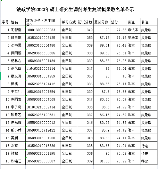 现将2023年硕士研究生调剂考生复试拟录取名单公示如下,公示时间十个工作日,2023年4月12日至2023年4月26日。如有异议,请以书面材料向六合直播 反馈。