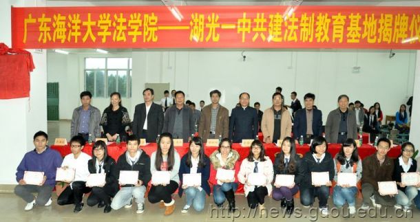 与湖光一中携手合作在湖光一中签订教育合作协议并举行“共建法制教育基地”揭牌仪式。校党委委员、规划与法规处处长谭树明、副处长吴汉华,法六合直播