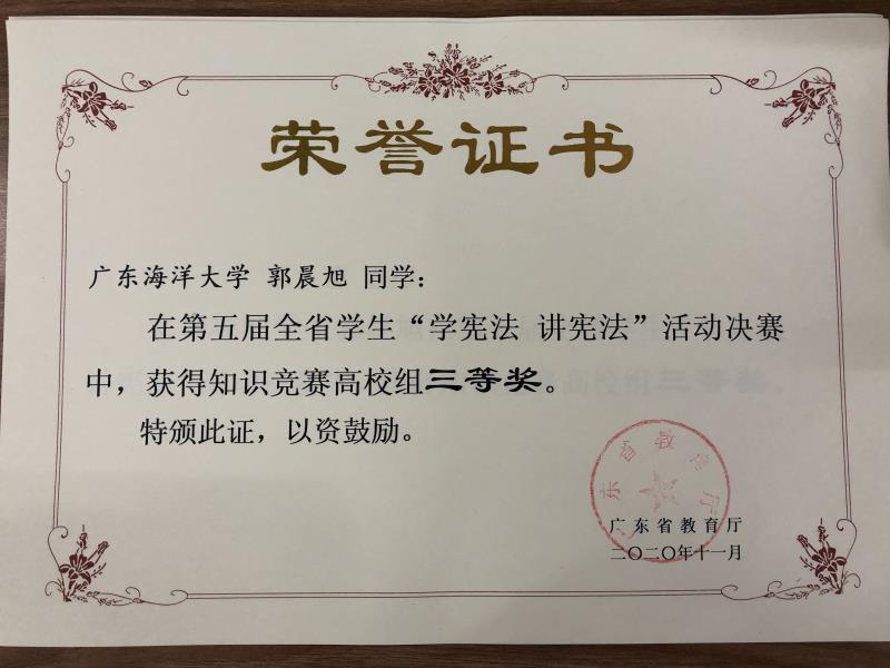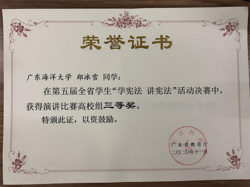 近日,六合直播 六合直播 法学专业18级1186班郑冰雪同学、19级1191班郭晨旭同学在今年省教育厅举办的全省学生“学宪法讲宪法”活动决赛中,分别获得演讲比赛高校组三等奖、知识竞赛高校组三等奖。